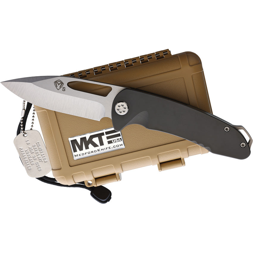 5.13" (13.03cm) closed. 4.25" (10.8cm) tumbled finish S35VN stainless blade. Gray PVD coated titanium handle. Thumb pull. Lanyard hole. Pocket clip. Extended tang. Water tight case. Boxed.