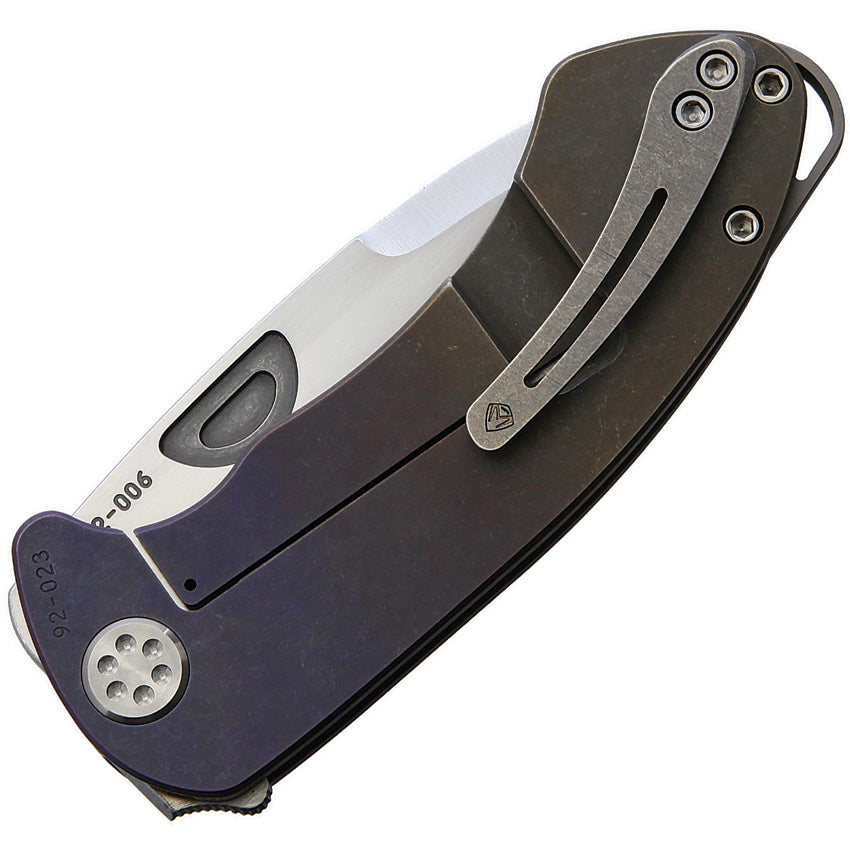4.63" closed. 3.63" satin finish S35VN stainless drop point blade. Anodized titanium handle. Extended tang. Lanyard hole. Pocket clip. Water tight storage case. Fade handle. Boxed.