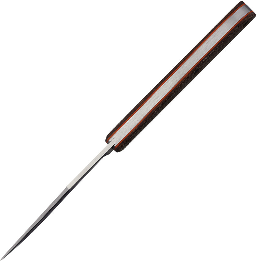 4.25" (10.8cm) closed. 2.63" satin finish Magnacut steel clip blade. Brown burlap micarta handle. Orange liners. Gift tin.