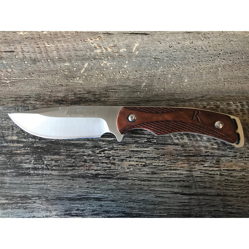 7.5" (19.05cm) overall. 3.5" (8.89cm) satin finish stainless blade. Brown checkered wood handle. Full, extended tang. Lanyard hole. Tan nylon belt sheath. Clam packed.