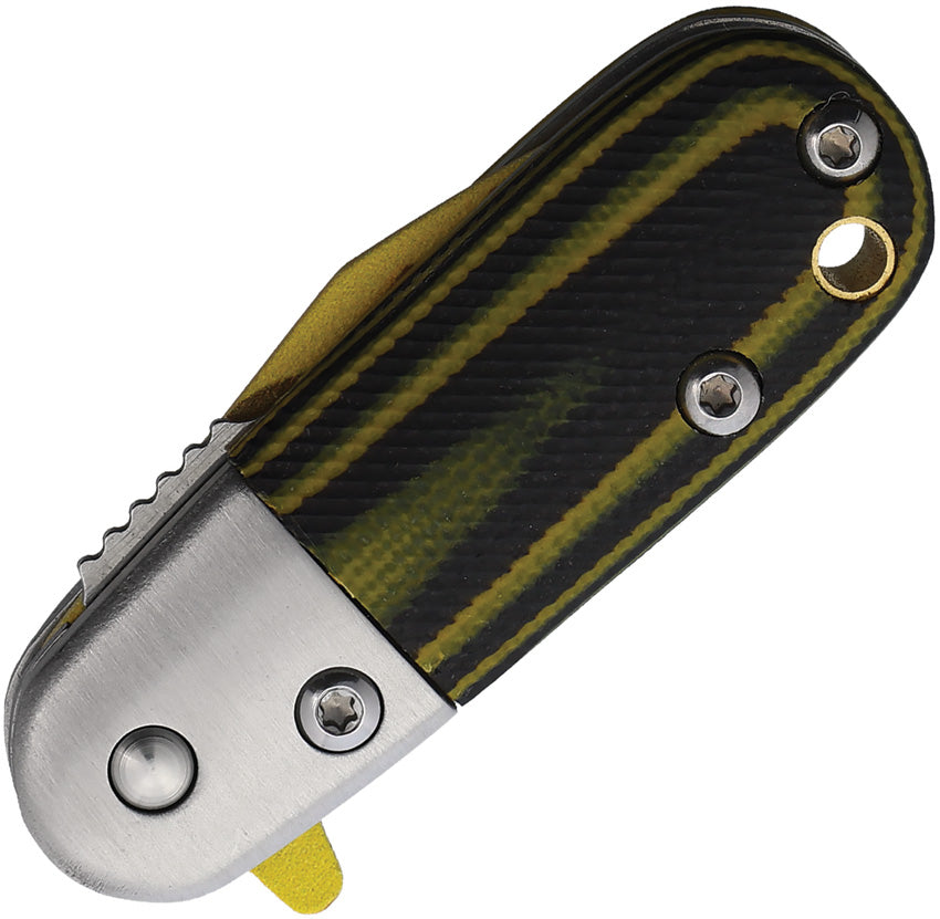 Assisted opening. 2" (5.08cm) closed. 1.38" (3.51cm) yellow coated stainless clip point blade. Black and yellow G10 handle. Extended tang. Lanyard hole. Bad Nanner blade artwork. Boxed.