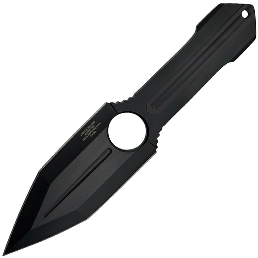 9" (22.86cm) overall. 4.63" (11.76cm) black oxide coated double edge 3Cr13 stainless spear point blade. Lanyard hole. One-piece construction. Full tang. Comes with extra coyote brown FRN belt sheath. Includes ambidextrous MOLLE clip. Black FRN belt sheath. Boxed.