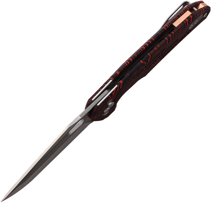 4.75" (12.07cm) closed. 3.5" (8.89cm) satin finish CPM S35VN stainless tanto blade. Black and red G10 G-Mascus handle. Extended tang. Thumb pull. Pocket clip. Includes hardside carry case. Boxed.