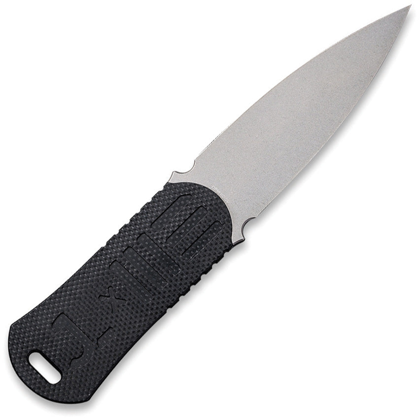 4.25" (10.8cm) overall. 2.25" (5.72cm) stonewash finish CPM-20CV stainless dagger blade. Black G10 handle. Full tang. Lanyard hole. Chisel grind blade. MOLLE Lok clip. Boxed.