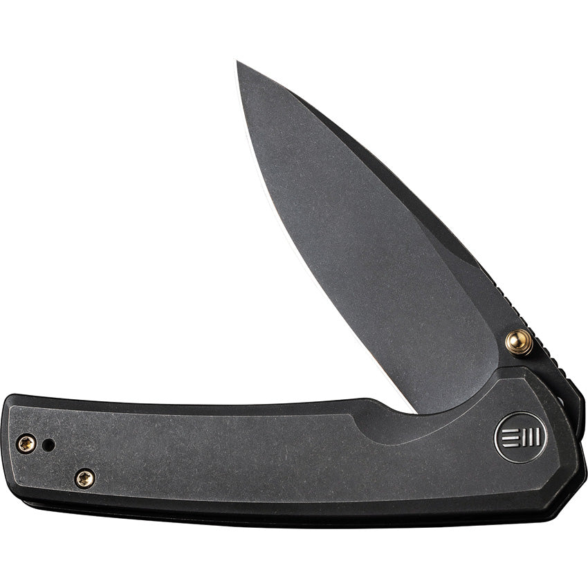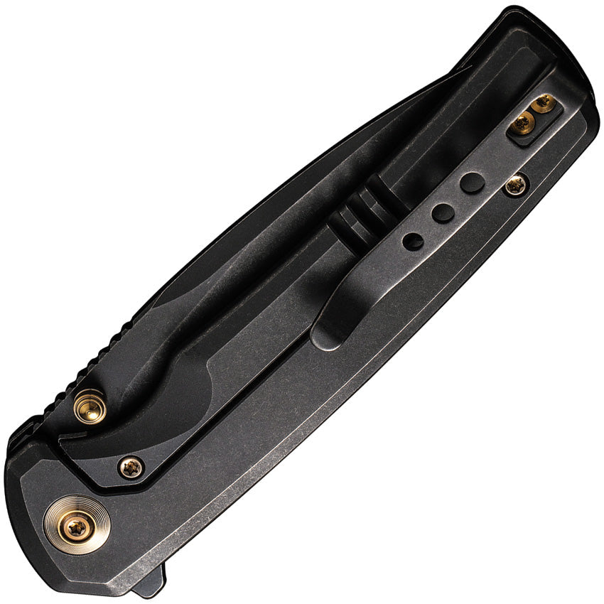 4.5" (11.43cm) closed. 3.5" (8.89cm) black stonewash finish CPM-20CV stainless blade. Black stonewash finish titanium handle. Extended tang. Pocket clip. Thumb stud. Boxed.