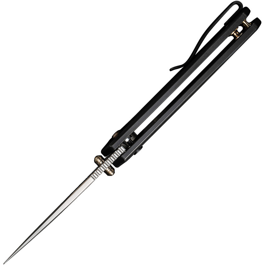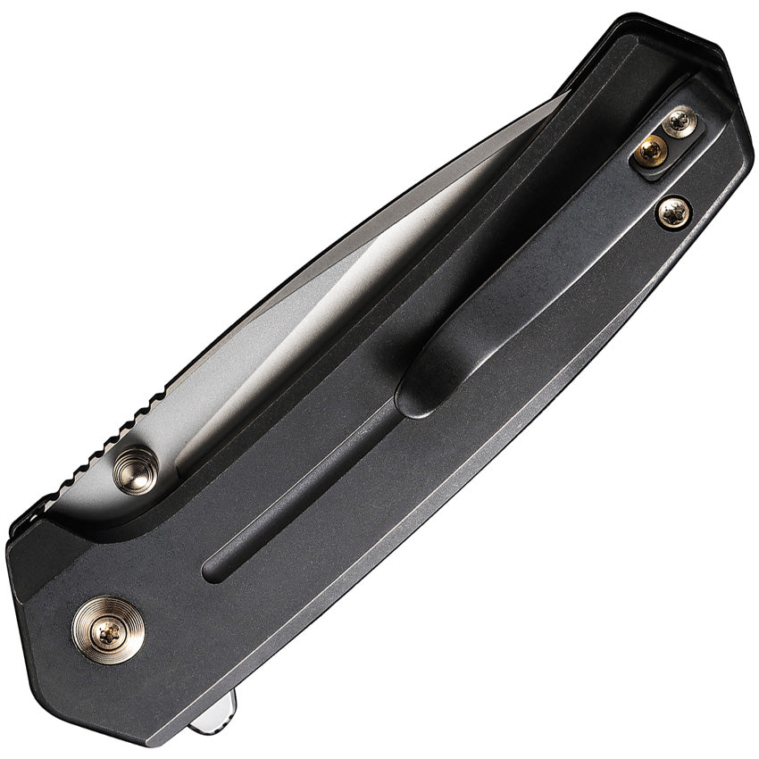 4.13" (10.49cm) closed. 3" (7.62cm) bead blast finish CPM-20CV stainless blade. Black stonewash finish titanium handle. Extended tang. Pocket clip. Thumb stud. Caged ceramic ball bearing. Black nylon zippered storage case. Boxed.