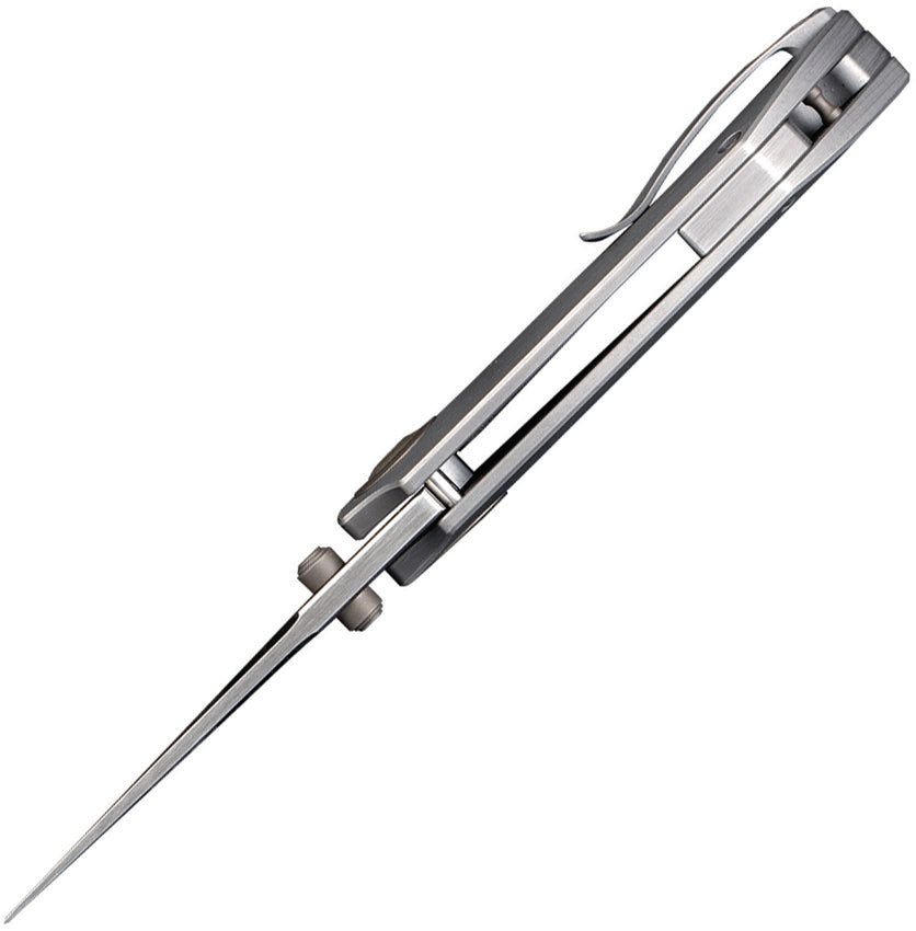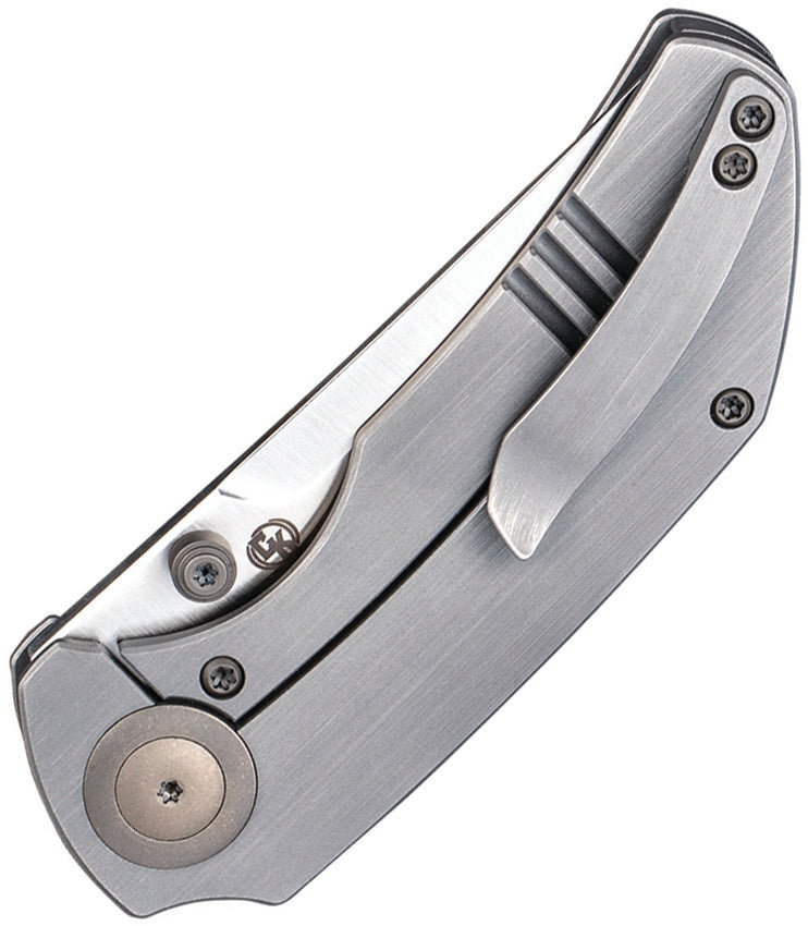 3.75" (9.53cm) closed. 2.75" (6.99cm) satin finish CPM-20CV stainless tanto blade. Hand rubbed titanium handle. Thumb stud. Pocket clip. Compound ground blade. Black nylon zippered storage case. Boxed.