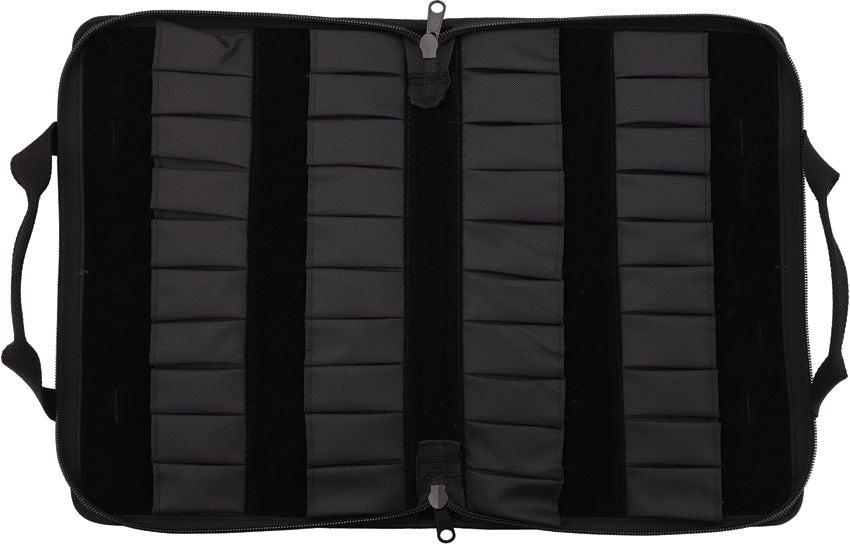 Dimensions: 18" x 12.25" x 1.13". Zippered nylon construction. Holds 40 knives. Color: Black. Bulk packed.