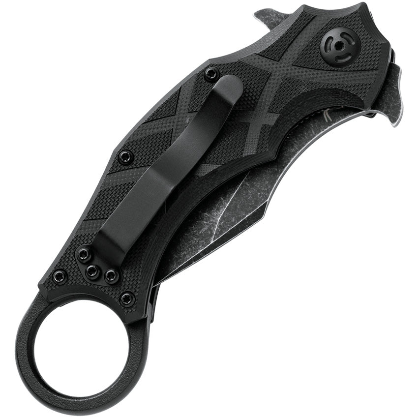 5" (12.7cm) closed. 2.5" (6.35cm) black stonewash finish 8Cr13MoV stainless tanto blade. Black G10 handle. Finger ring. Extended tang. Pocket clip. Emerson Wave System. Clam packed.