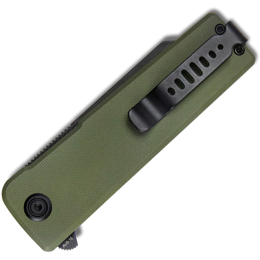4" (10.16cm) closed. 3" (7.62cm) black stonewash finish AUS-10A stainless blade. OD green G10 handle. Extended tang. Pocket clip. Boxed.