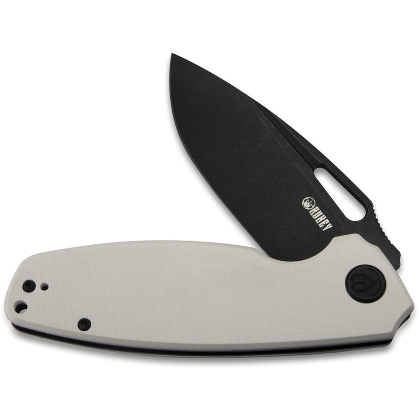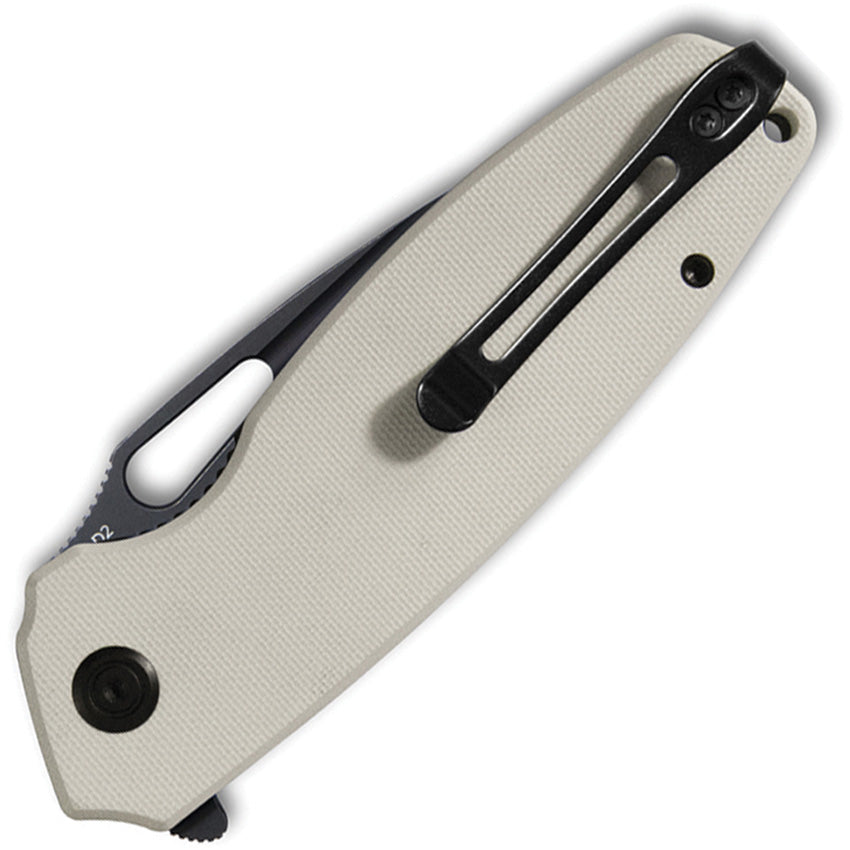 4.75" (12.07cm) closed. 3.38" (8.59cm) black stonewash finish D2 tool steel blade. Ivory G10 handle. Extended tang. Thumb pull. Pocket clip. Boxed.