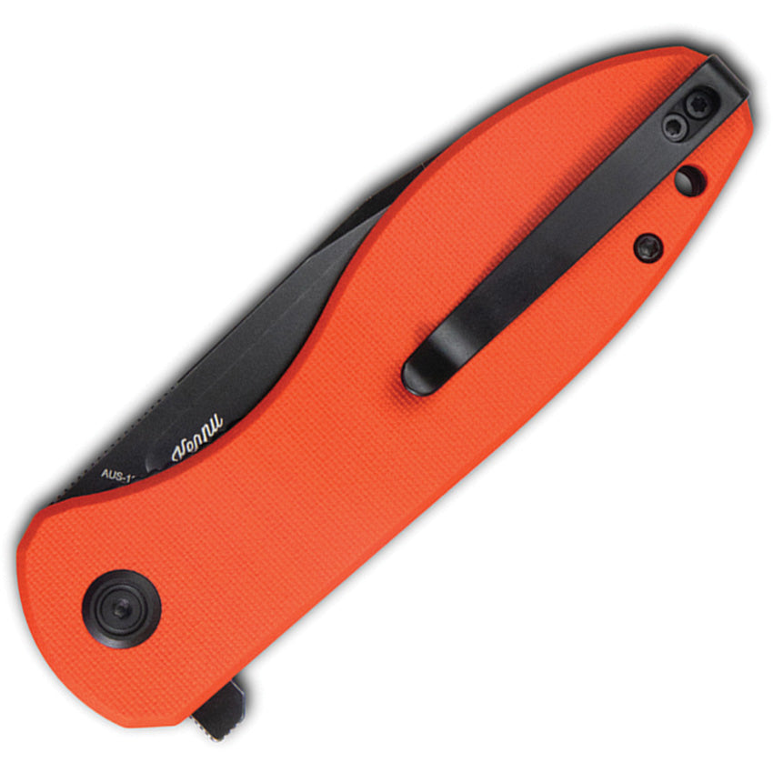 4.63" (11.76cm) closed. 3.63" (9.22cm) black stonewash finish AUS-10A stainless blade. Orange G10 handle. Extended tang. Lanyard hole. Pocket clip. Boxed.