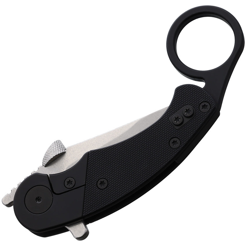 4.75" (12.07cm) closed. 2.5" (6.35cm) stonewash finish 9Cr18MoV stainless blade. Black stainless handle with black G10 inlay. Thumb disk. Pocket clip. Extended tang. Finger ring. Comes with set of thumb studs. Boxed.
