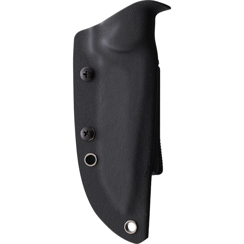 9" (22.86cm) overall. 4" (10.16cm) gray finish D2 tool steel blade. Full, extended tang. Lanyard hole. Carbon fiber resin handle with copper flecks. Black Kydex belt sheath. Boxed.