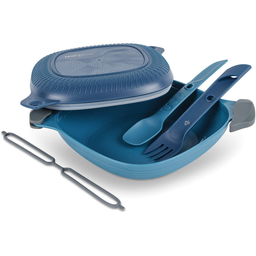 Dimensions: 8" x 8" x 3". Dishwasher safe. Includes: ECO bowl/container; ECO plate/lid; ECO Switch Spork (2 pieces); Tether. Locking lid with silicone gasket ensures leak-proof seal. BPA and Phthalate free. Color: Ocean (dark blue and light blue). Recycled polypropylene, silicone, reinforced nylon construction.