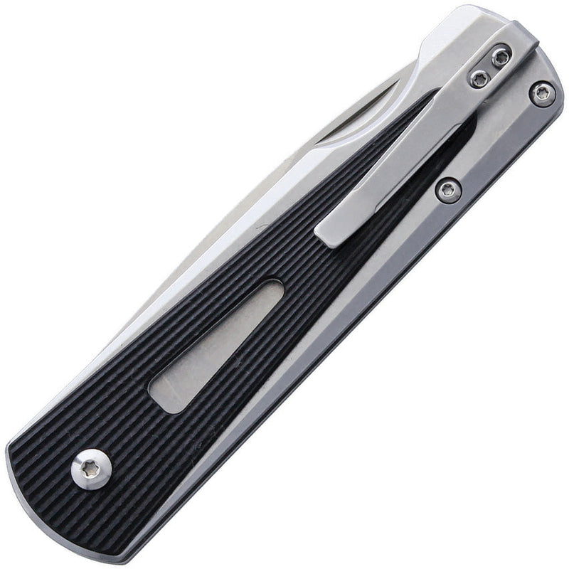 4.5" closed. 3.25" stonewash finish Bohler N690 stainless blade. Stainless handle with black G10 onlay. Pocket clip. Involves two-legged spring located on the side of the handle. Spring tension holds the blade firmly in place in the opened or closed position, but there's no guillotine effect when closing the blade. Boxed.