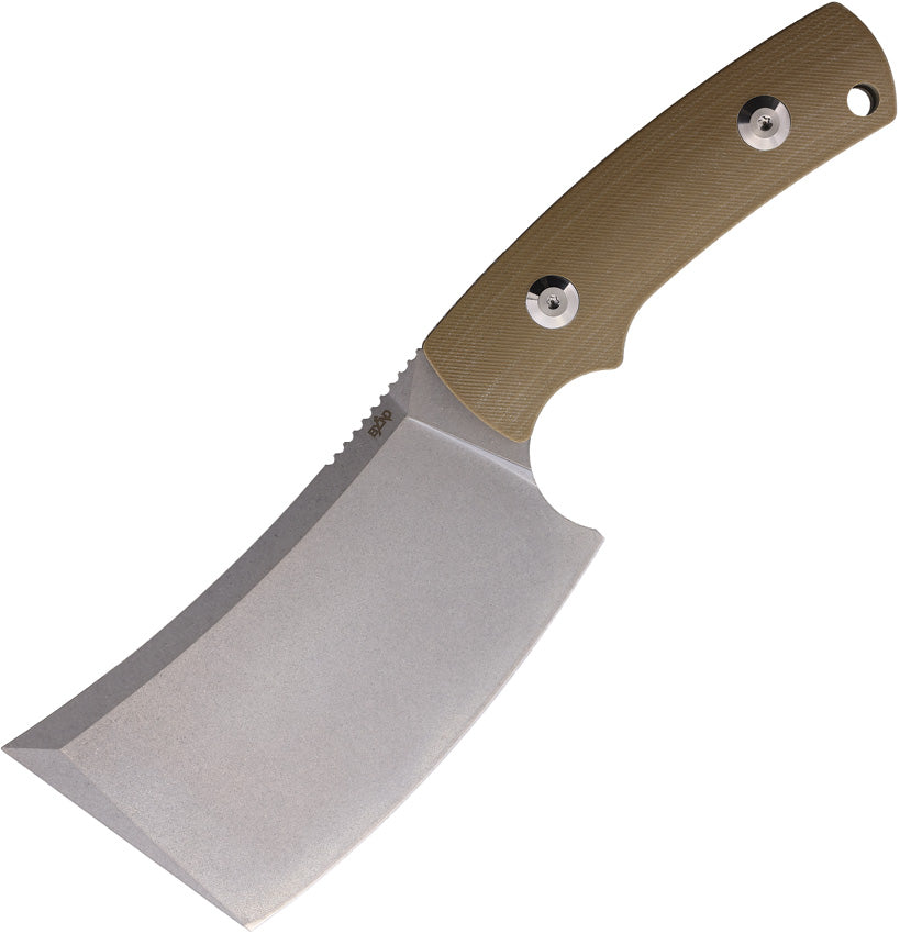 8.25" (20.96cm) overall. 4.25" (10.8cm) stonewash finish VG-10 stainless blade. Tan G10 handle. Full tang. Lanyard hole. Black Kydex belt sheath. Boxed.