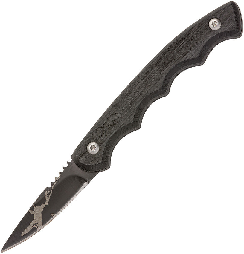 Black finish 9Cr stainless blade. Black finger grooved polymer handle. Blade etching. Full tang. 8.25" overall skinner with 3.75" blade and 6" overall caping with 2" blade. Black nylon belt sheath. Clam packed.