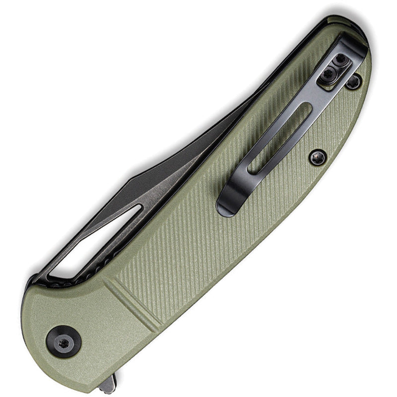 4.25" (10.8cm) closed. 3.25" (8.26cm) black stonewash finish 9Cr18MoV stainless clip point blade. OD green FRN handle. Extended tang. Thumb pull. Pocket clip. Boxed.