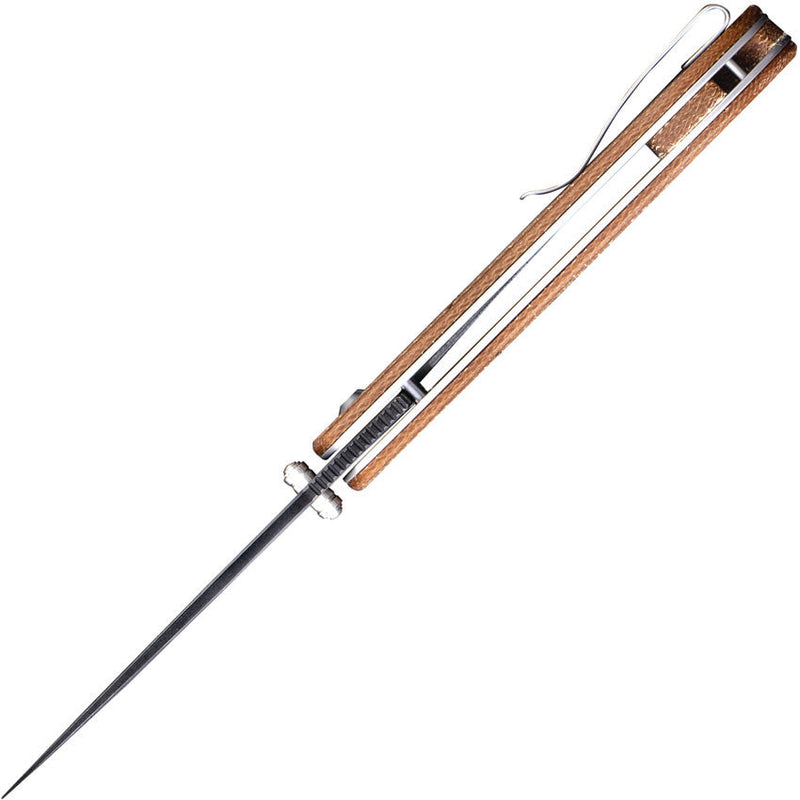 4.5" (11.43cm) closed. 3.5" (8.89cm) Damascus steel blade. Brown micarta handle. Thumb stud. Extended tang. Pocket clip. Black hand rubbed finish blade. Black nylon zippered storage case. Boxed.