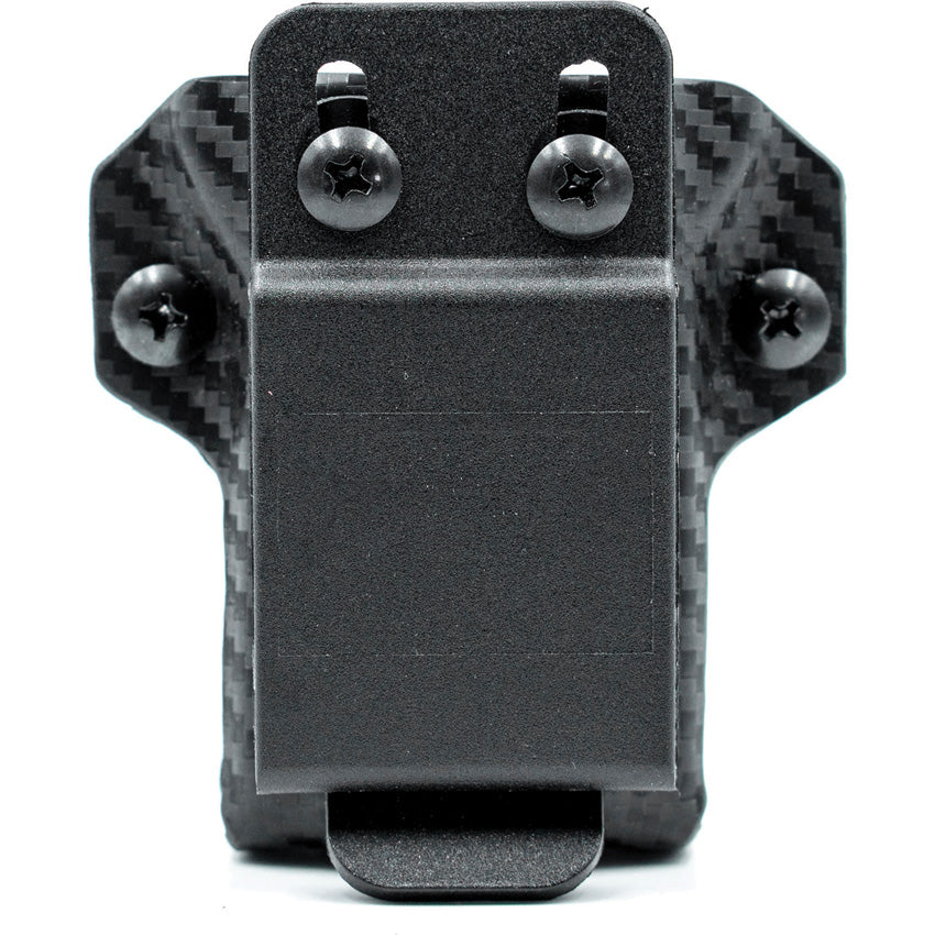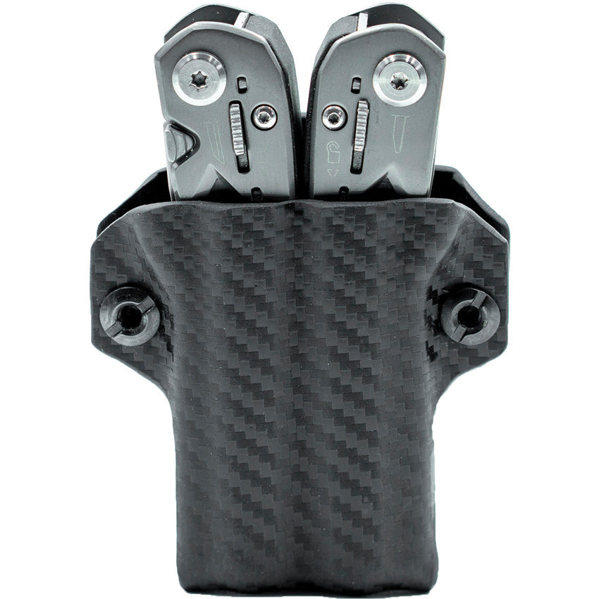 Gerber Suspension Sheath. Compatible with the Gerber Suspension. Pocket clip fits belts up to 1.75". Adjustable retention. Carbon fiber pattern. Kydex construction. Hang packaged.