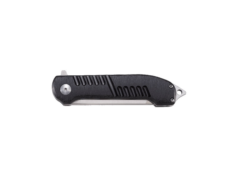 4.63" (11.76cm) closed. 3" (7.62cm) satin finish 8Cr13MoV stainless blade. Black aluminum handle. Lanyard hole. Pocket clip. Extended tang. Chisel blade. Designed by Jon Graham.