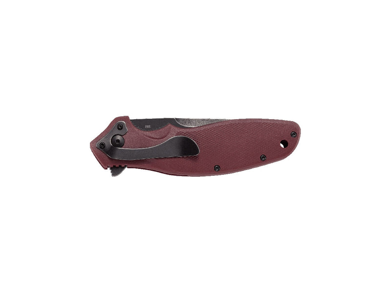 Assisted opening. 4.88" (12.4cm) closed. 3.25" (8.26cm) black stonewash finish 1.4116 stainless blade. Maroon GRN handle. Extended tang. Lanyard hole. Pocket clip.