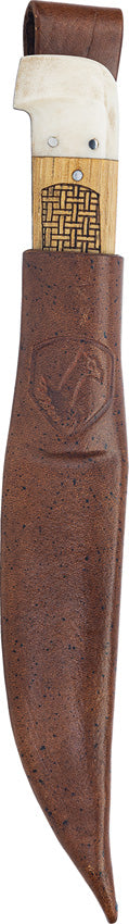 8" (20.32cm) overall. 3.88" (9.86cm) satin finish Scandi grind 14C28N Sandvik stainless blade. American hickory and micarta handle. Brown leather belt sheath. Boxed.