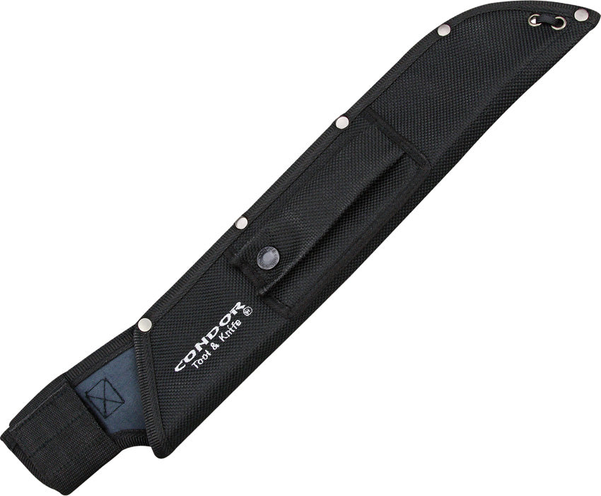 19 3/4" overall. 13" 1075 high carbon steel blade with natural finish. Molded olive green high impact polypropylene handle. Lanyard hole. Black nylon belt sheath with cord lanyard.