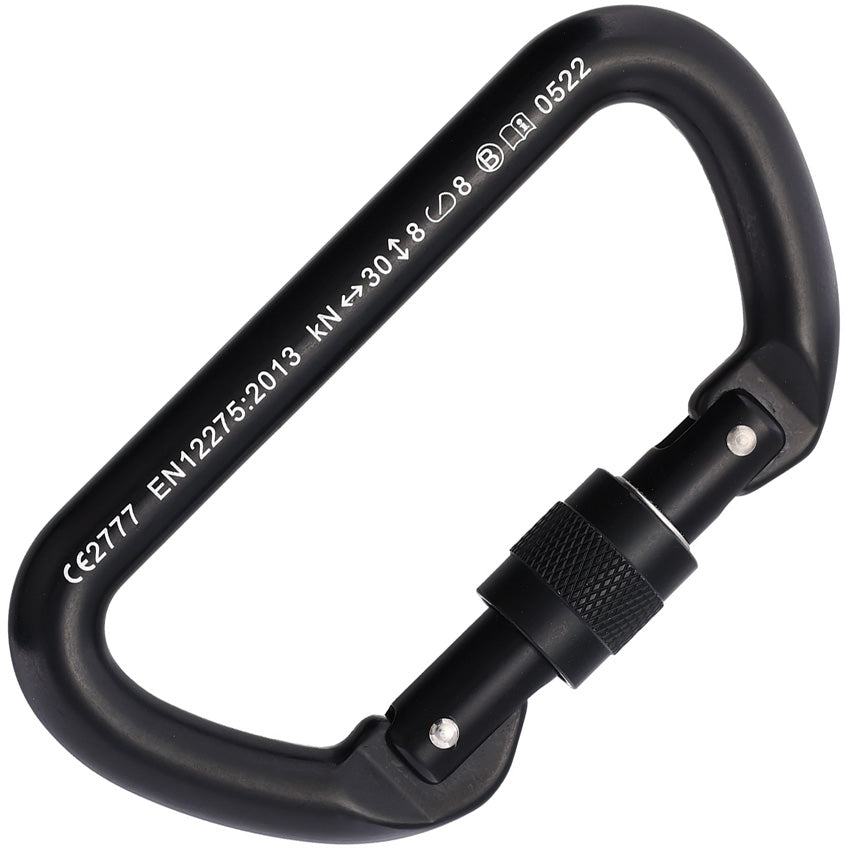 4.25" overall. Screw gate. Black finish. Weight: 80 grams. Strength: 30kN. CE certified. Ideal for racking equipment or for ropes courses. Bulk packed.