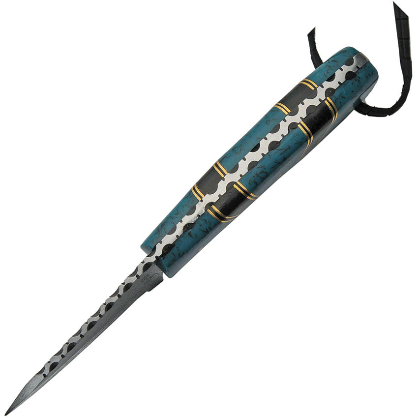 7.25" (18.42cm) overall. 3" (7.62cm) Damascus steel blade. Black and blue synthetic handle. Full tang. Leather cord lanyard. Brown leather belt sheath. Boxed.