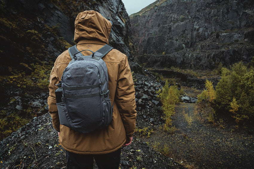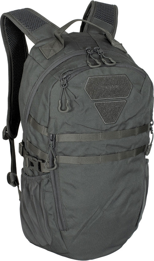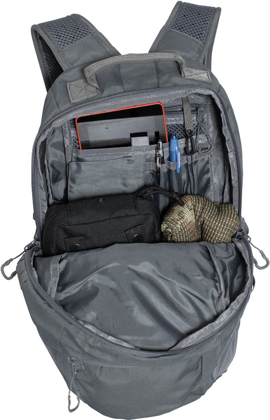 Dimensions: 18.88" x 11" x 5.75". 20 liter capacity. Front zipped stash pocket. Front zipped large pocket. Front zip quick access to main compartment. (2) side compression straps. (2) elastic side pockets. Detachable inner organizer. Adjustable padded shoulder and chest straps. Airmesh padded back system. Hook and loop ID patch. Hydration pocket with pass through port. Color: Tornado gray. Bulk packed.
