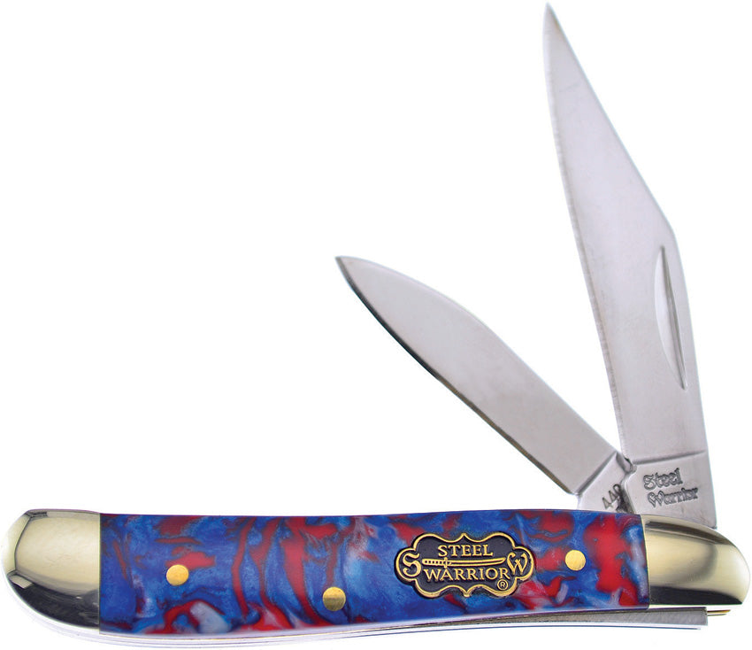 2.88" (7.32cm) closed. Mirror finish stainless clip and pen blades. Red, white, and blue resin handle. Nickel silver bolster(s). Inlay shield. Boxed.