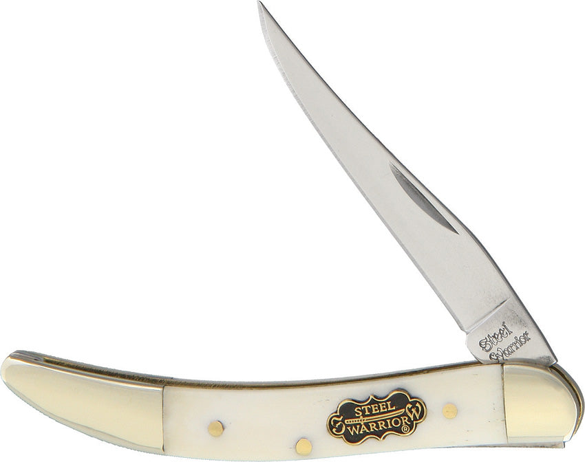 Steel Warrior. 3" closed. Mirror finish stainless long clip blade. White smooth bone handle. Nickel silver bolster(s). Inlay shield. Boxed.