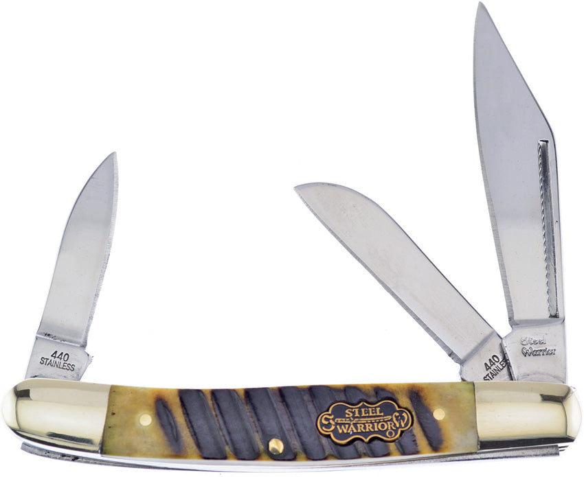 3.88" (9.86cm) closed. Mirror finish stainless clip, sheepsfoot, and pen blades. Chainsaw jigged bone handle. Nickel silver bolster(s). Inlay shield. Boxed.