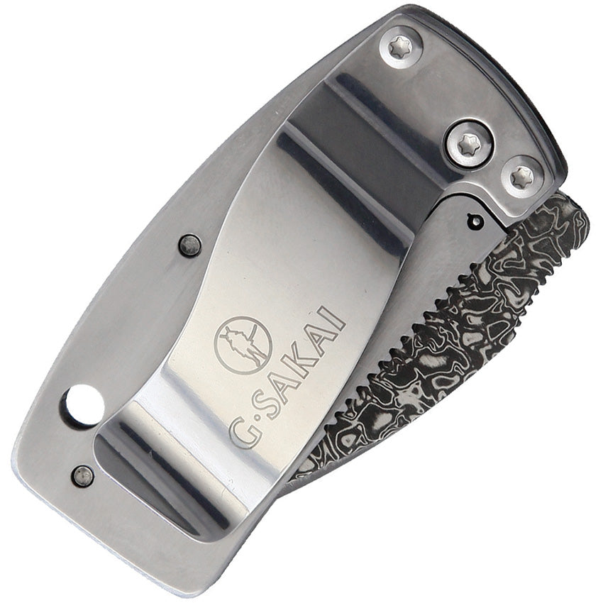 2.13" (5.41cm) closed. 1" (2.54cm) blade. Brushed stainless handle. Lanyard hole. Damascus steel blade with VG-10 core. Paw handle artwork. Money clip. Boxed with hanging tab.