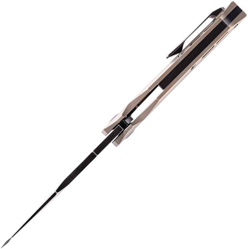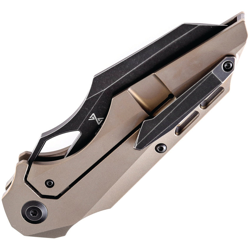 4.75" (12.07cm) closed. 3.5" (8.89cm) black stonewash finish CPM S35VN stainless blade. Bronze anodized titanium handle. Thumb pull. Lanyard hole. Pocket clip. Black nylon pouch. Boxed.