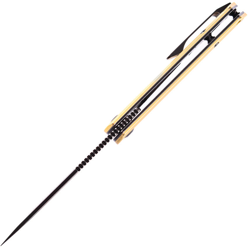 4.5" (11.43cm) closed. 3.5" (8.89cm) black stonewash finish CPM S35VN stainless blade. Brass handle. Lanyard hole. Pocket clip. Black nylon pouch. Boxed.