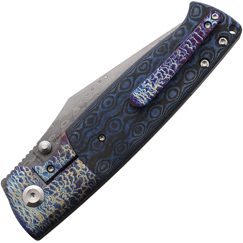 5.25" (13.34cm) closed. 4.25" (10.8cm) Damascus steel blade. Black and blue carbon fiber handle. Thumb stud. Lanyard hole. Pocket clip. Rose pattern blade and handle. Lightning strike anodized titanium bolster. Black nylon pouch. Boxed.