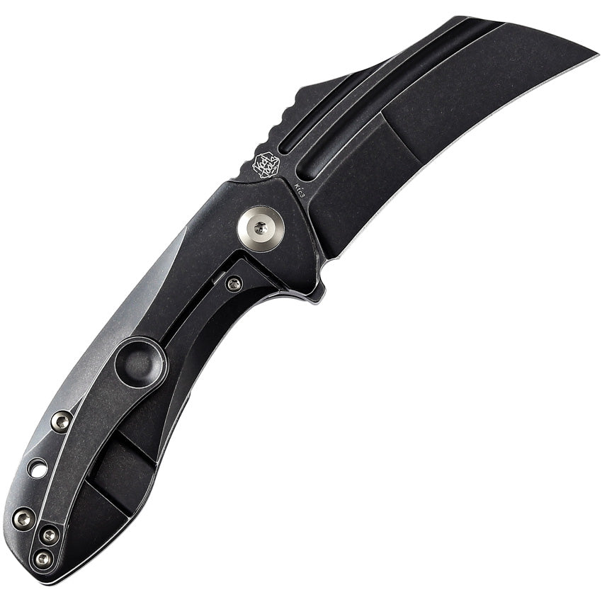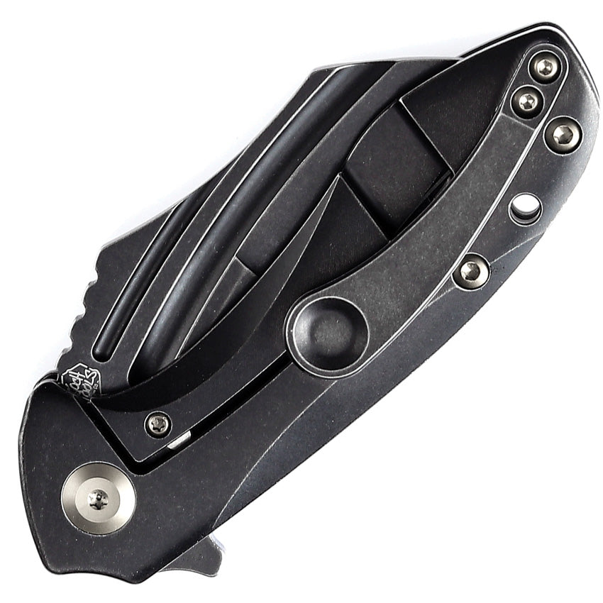 4" (10.16cm) closed. 3" (7.62cm) black stonewash finish CPM S35VN stainless blade. Black stonewash finish titanium handle. Extended tang. Lanyard hole. Pocket clip. Black nylon pouch. Boxed.