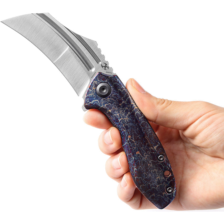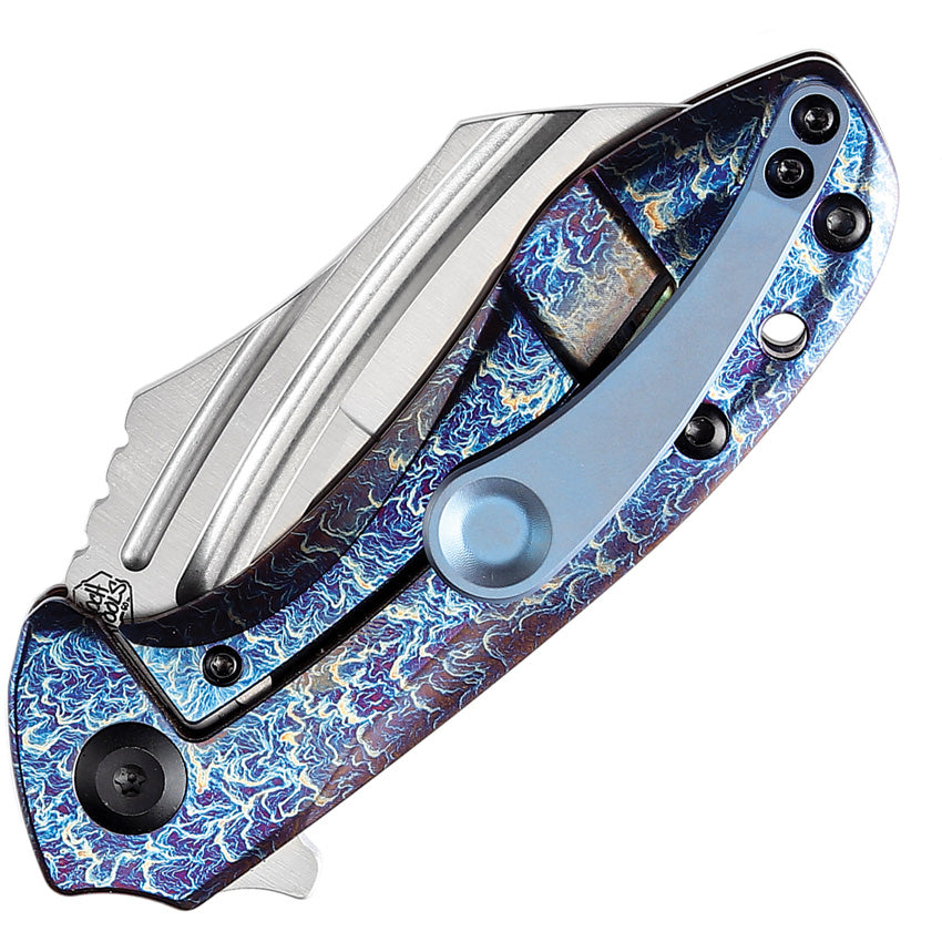 4" (10.16cm) closed. 3" (7.62cm) satin finish CPM S35VN stainless blade. Lightning strike anodized titanium handle. Extended tang. Lanyard hole. Pocket clip. Black nylon pouch. Boxed.