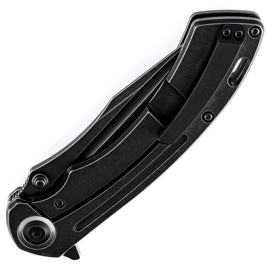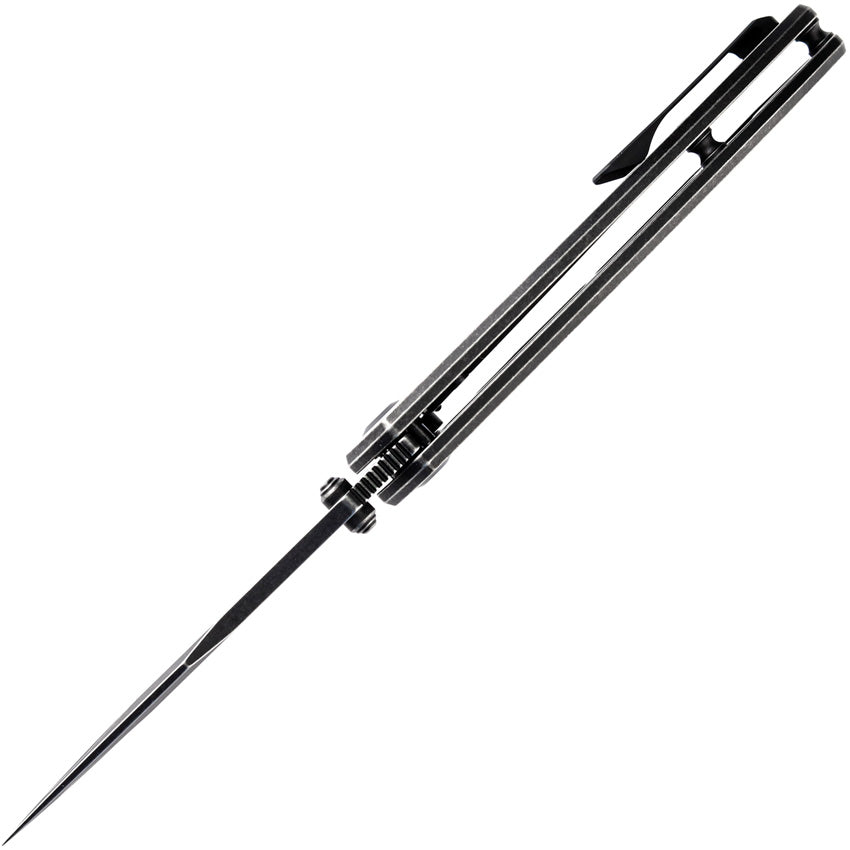 4.75" (12.07cm) closed. 3.75" (9.53cm) black TiNi coated CPM S35VN stainless drop point blade. Black stonewash finish titanium handle. Extended tang. Thumb stud. Lanyard hole. Pocket clip. Black nylon pouch. Boxed.