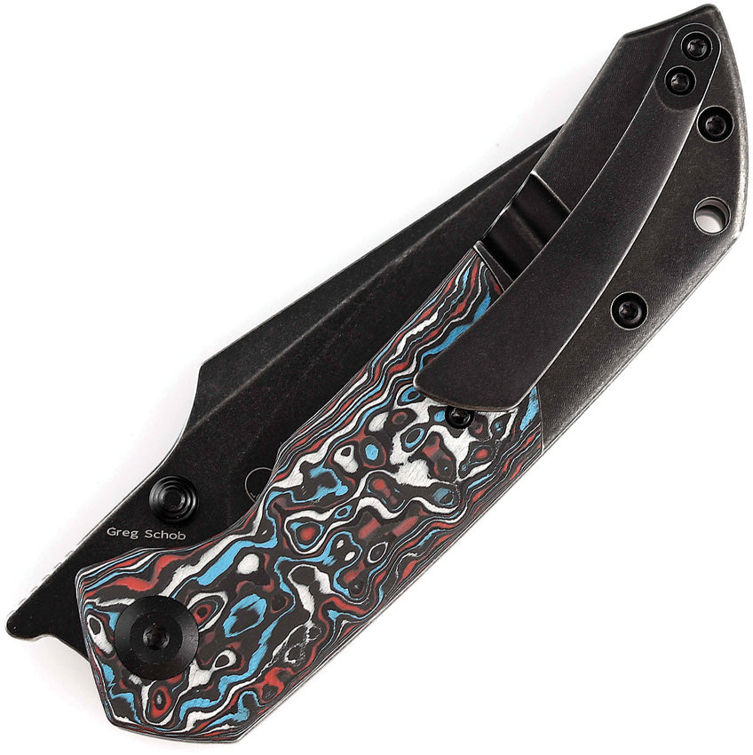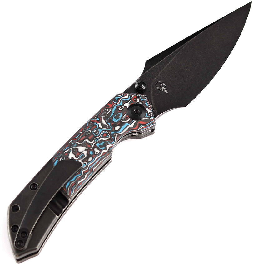4.5" (11.43cm) closed. 3.5" (8.89cm) black stonewash finish CPM S35VN stainless blade. Red, black, white, blue carbon fiber handle. Thumb stud. Lanyard hole. Pocket clip. Black nylon pouch. Boxed.