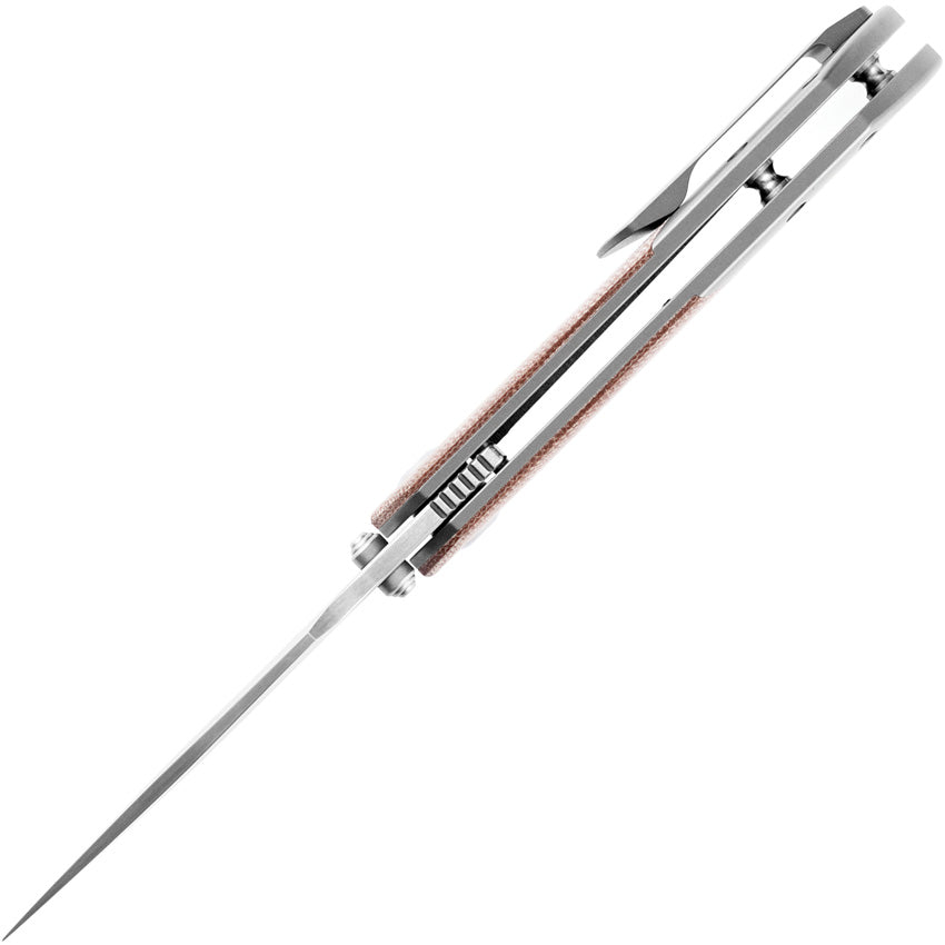 4.5" (11.43cm) closed. 3.5" (8.89cm) satin finish CPM S35VN stainless blade. Gray titanium handle with brown micarta inlay. Thumb stud. Lanyard hole. Extended tang. Pocket clip. Black nylon pouch. Boxed.