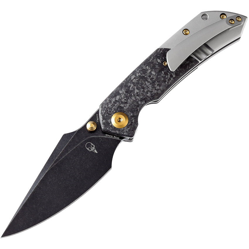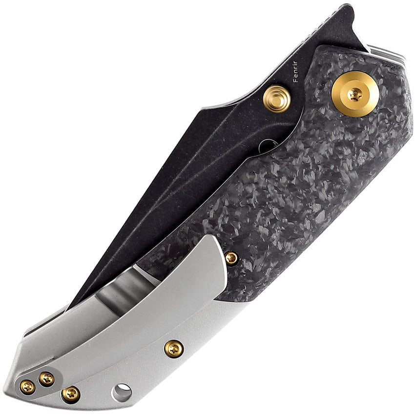 4.5" (11.43cm) closed. 3.5" (8.89cm) black stonewash finish CPM S35VN stainless blade. Gray titanium handle with shredded carbon fiber inlay. Thumb stud. Lanyard hole. Pocket clip. Extended tang. Left handed version. Black nylon pouch. Boxed.