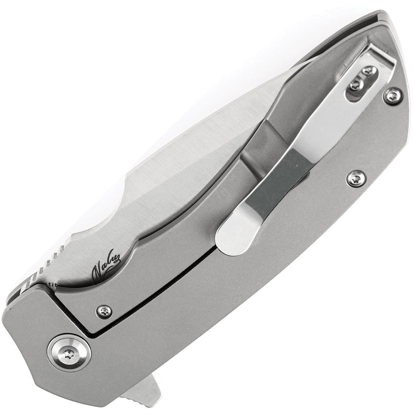 4.5" (11.43cm) closed. 3.5" (8.89cm) satin finish CPM S35VN stainless blade. Gray titanium handle. Extended tang. Pocket clip. Black nylon pouch. Boxed.