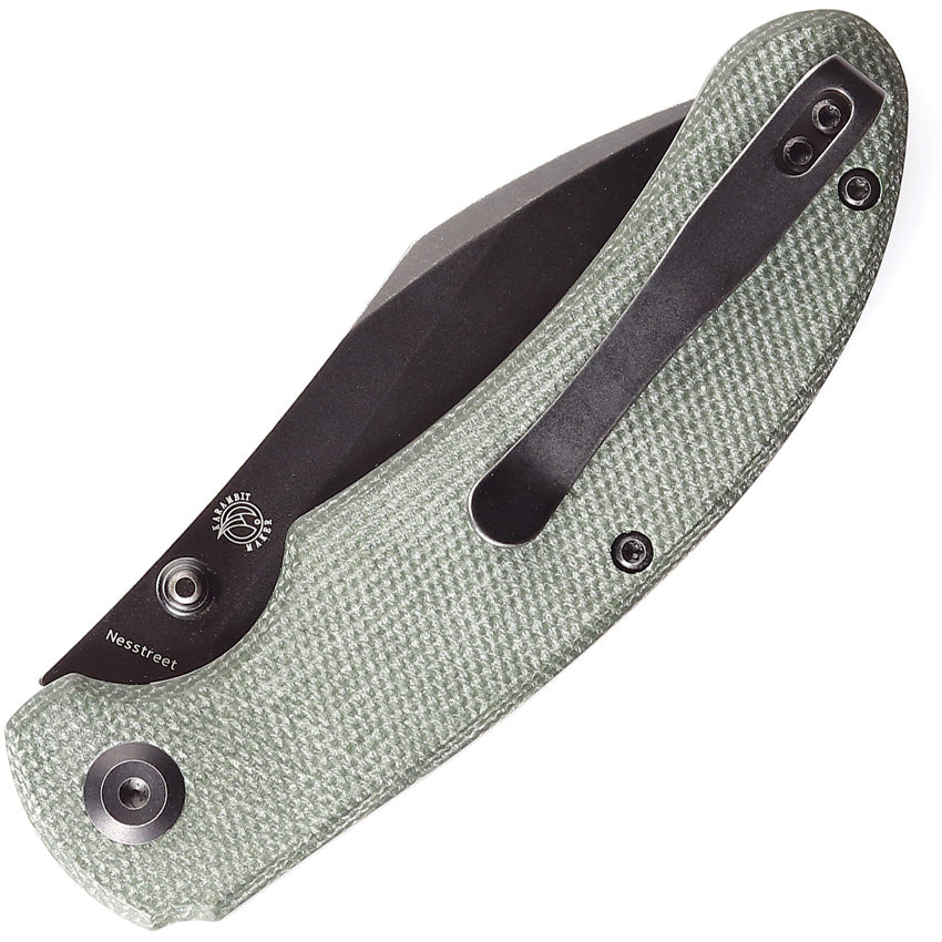 4.5" (11.43cm) closed. 3.5" (8.89cm) black stonewash finish CPM S35VN stainless blade. Green canvas micarta handle. Thumb stud. Pocket clip. Black nylon pouch. Boxed.