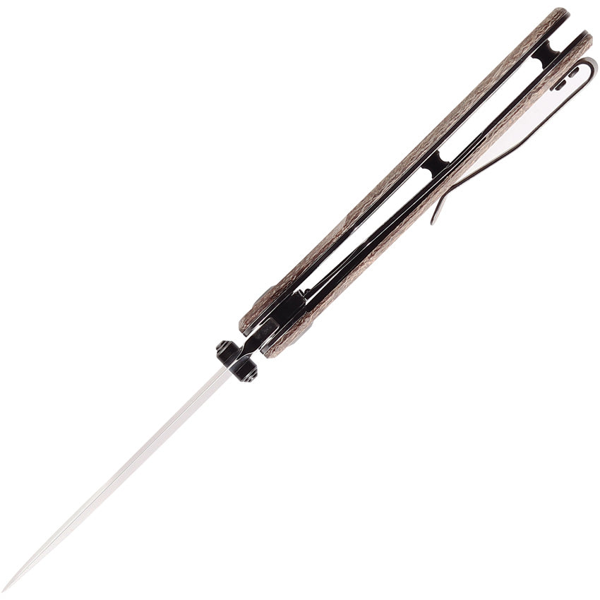 4.5" (11.43cm) closed. 3.5" (8.89cm) black stonewash finish CPM S35VN stainless blade. Brown canvas micarta handle. Thumb stud. Pocket clip. Black nylon pouch. Boxed.