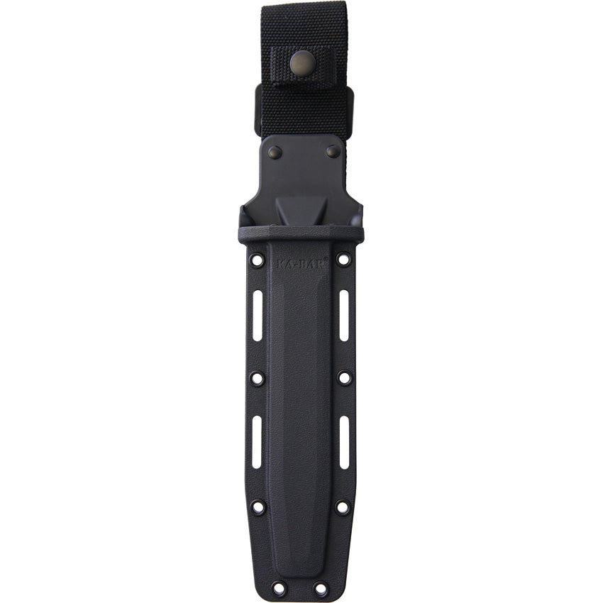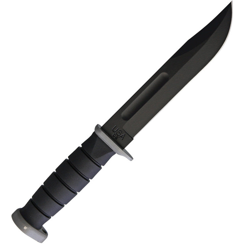 12" (30.48cm) overall. 7" (17.78cm) black powder coated D2 tool steel clip point blade. Black Kraton handle. Stainless guard and pommel. Black polymer belt sheath. Boxed.