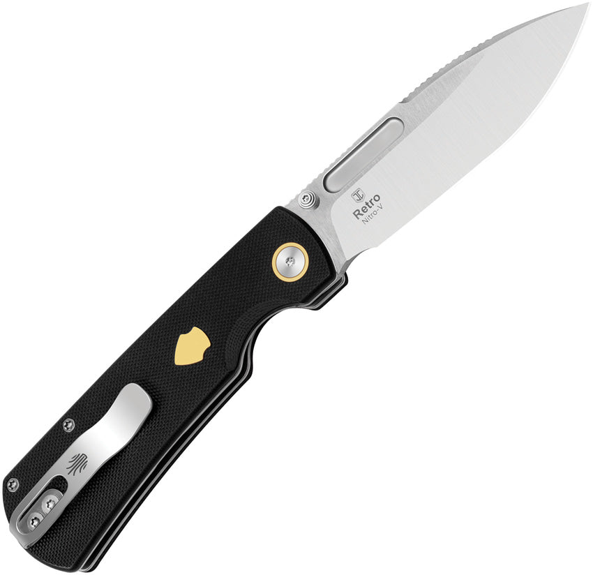 4.58" (11.63cm) closed. 3.5" (8.89cm) satin finish Nitro V steel drop point blade. Black G10 handle. Thumb stud. Pocket clip. Brass inlay shield and pivot collar. Boxed.